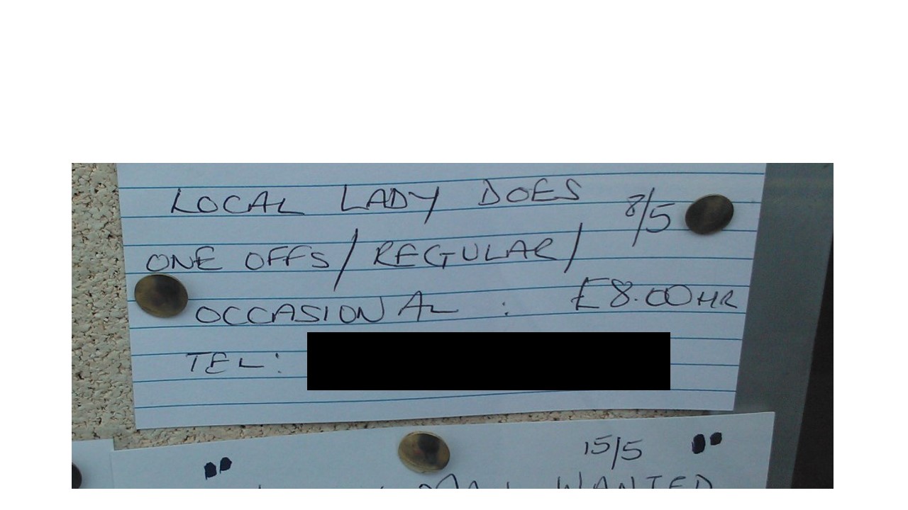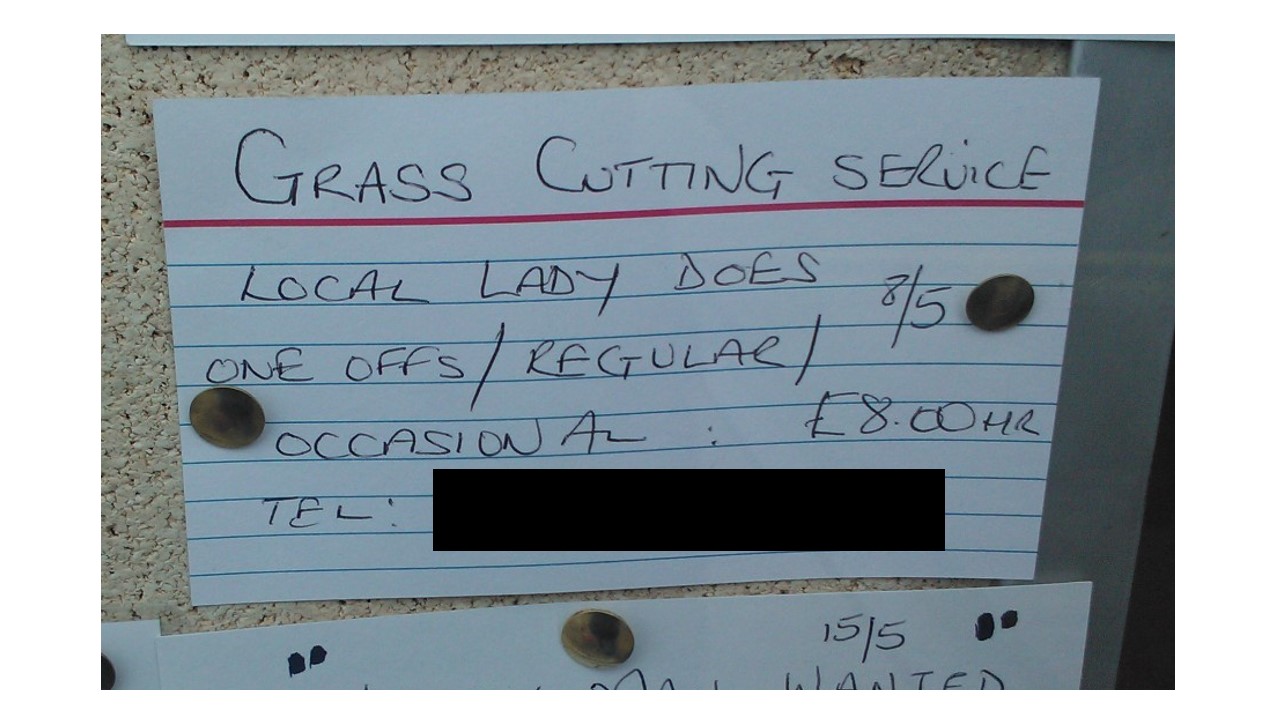I was propped up outside the post office, watching coffin dodgers wobbling wheezily in and out of the door, and was finally sufficiently overcome with tedium to review that most ancient portal of local nonsense, for local people: The pin board in the window.